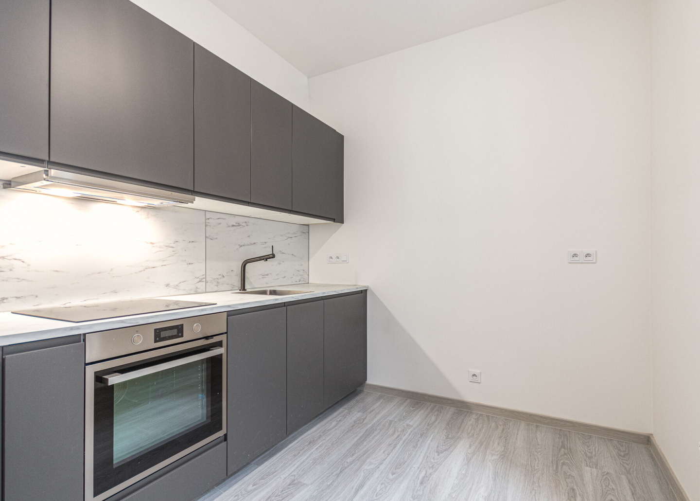 Upon entering, you are welcomed by a hallway with direct access to the bathroom, which includes a washer and dryer. The hallway leads to the kitchen area, featuring a brand-new kitchen unit fully equipped with built-in appliances – a dishwasher, fridge with freezer, oven, and induction cooktop.