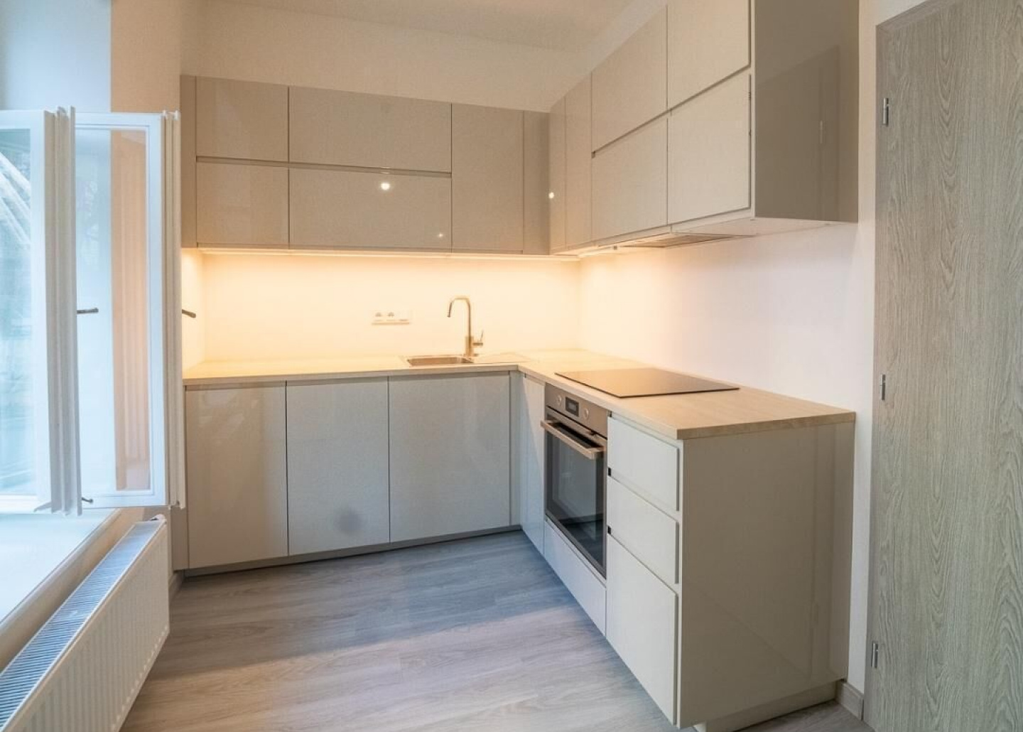 Upon entering the apartment, you are greeted by a spacious hallway with an adjoining bathroom. From here, you step into the living room with a well-designed kitchen. The kitchen layout is cleverly arranged so that the living area is set further back, providing a sense of privacy. The apartment also includes a separate bedroom, ensuring comfortable living.