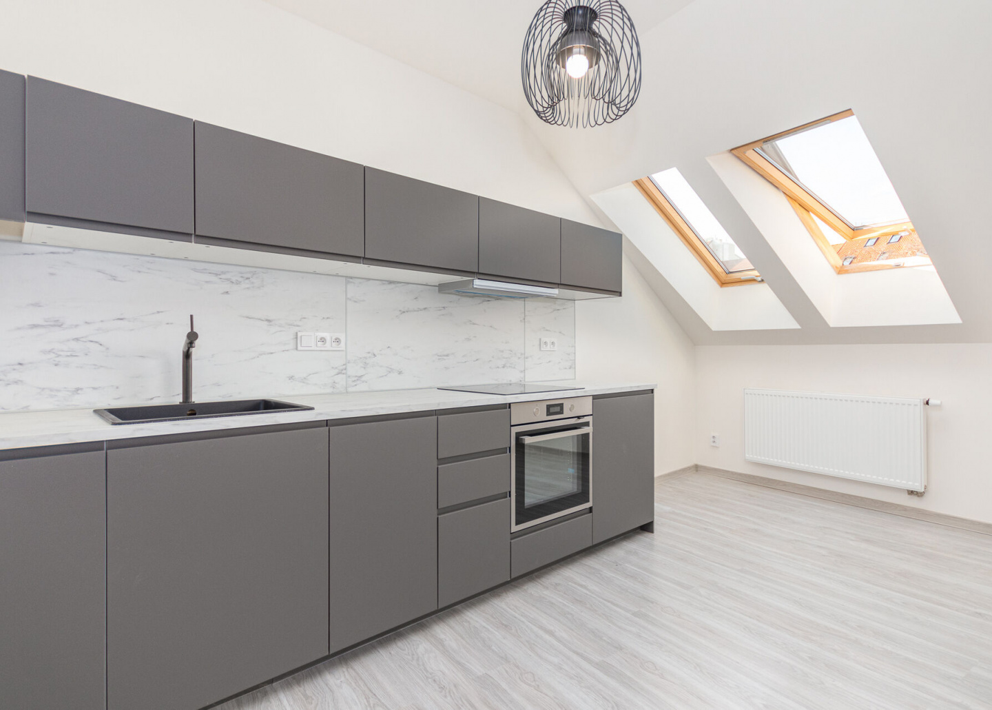Kuchyňská linka je plně vybavena vestavěnými spotřebiči – indukční varnou deskou, elektrickou troubou, pračkou a lednicí s mrazákem, což zvyšuje komfort bydlení a činí byt ihned obyvatelným.